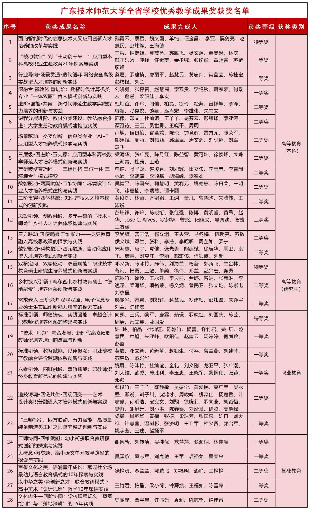 近日,广东省人力资源和社会保障厅联合广东省教育厅公布2025年全省学校优秀教学成果奖获奖名单,我校凭借扎实的教育教学改革实践与突出的成果积淀,共斩获28项成果,获奖数量再创新高。其中,高等教育教学成果奖本科类14项(特等奖1项,一等奖3项,二等奖10项)、研究生类3项(特等奖1项,二等奖2项);职业教育教学成果奖6项(特等奖1项、一等奖3项、二等奖2项);基础教育教学成果奖5项(一等奖2项,二等奖3项)。本次评选,学校获奖等级、数量与质量均位居省属同类高校前列,特别是学校首获3项特等奖,一举实现省级教学成果奖特等奖“零的突破”,充分彰显了学校在深化教育教学改革,提升人才培养质量,发挥“技术+师范”人才培养特色,推进教育高质量发展的扎实成效。