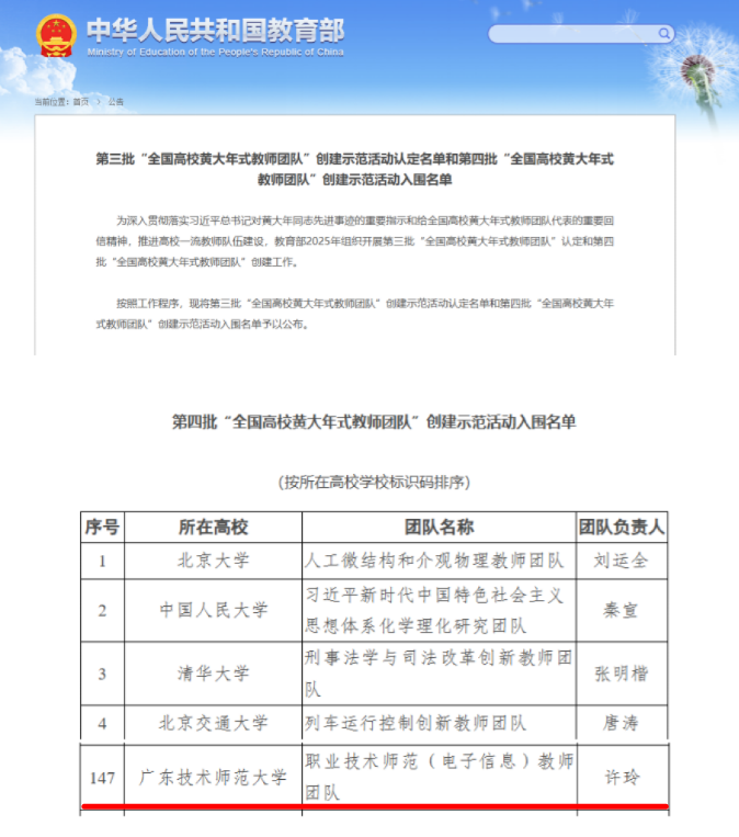 近日,教育部正式公布第四批“全国高校黄大年式教师团队”创建示范活动入围名单,学校副校长许玲带领的职业技术师范(电子信息)教师团队成功入选,实现了学校在该国家级重要荣誉上“零的突破”!