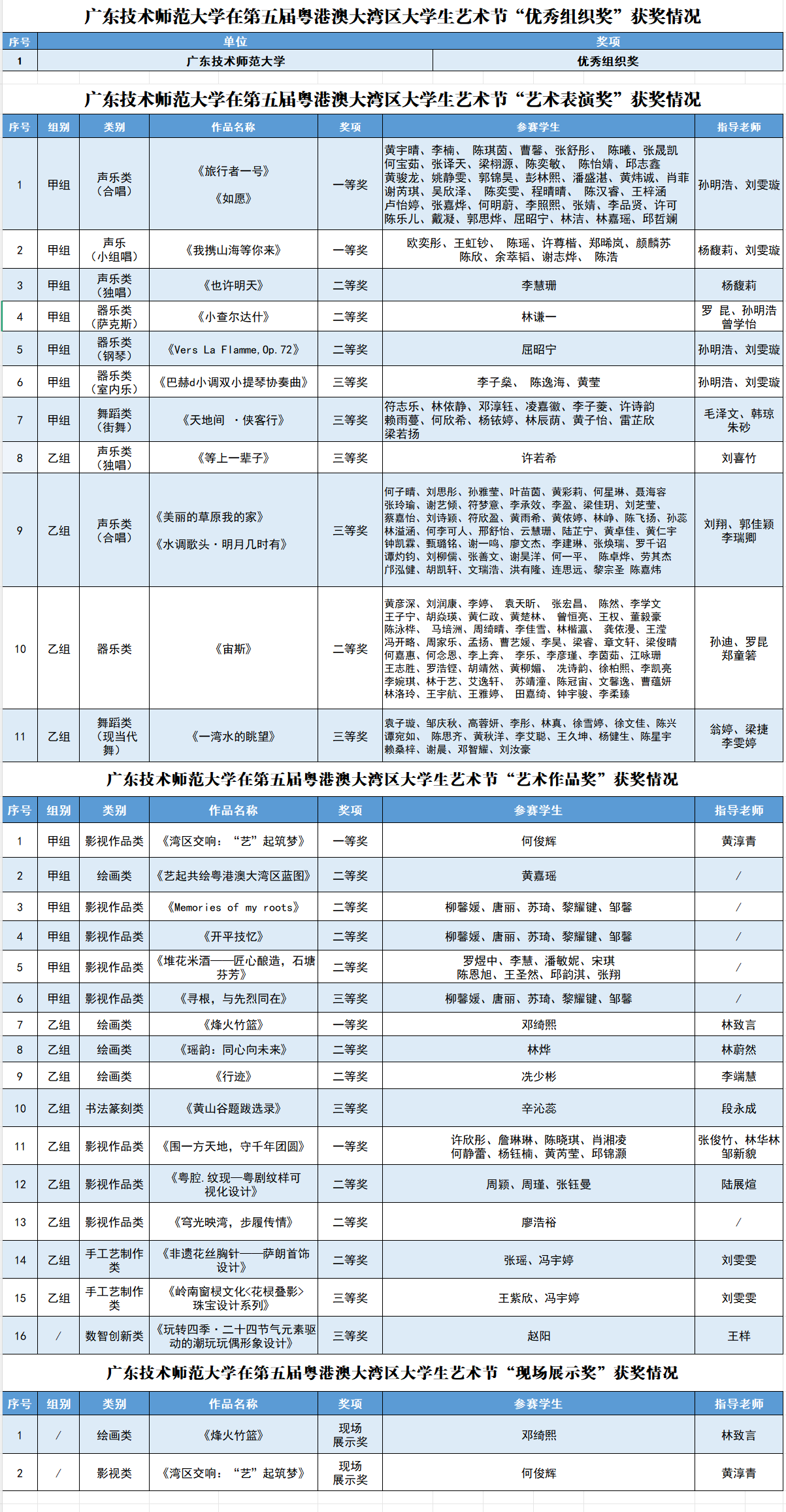 近日,广东省教育厅公布了第五届粤港澳大湾区大学生艺术节获奖名单。我校师生在本次大赛中表现优异,成果丰硕,共斩获奖项42项,其中一等奖5项、二等奖13项、三等奖9项、“优秀指导教师奖”12项、优秀组织奖1项,现场展示奖2项,获奖数量创新高。