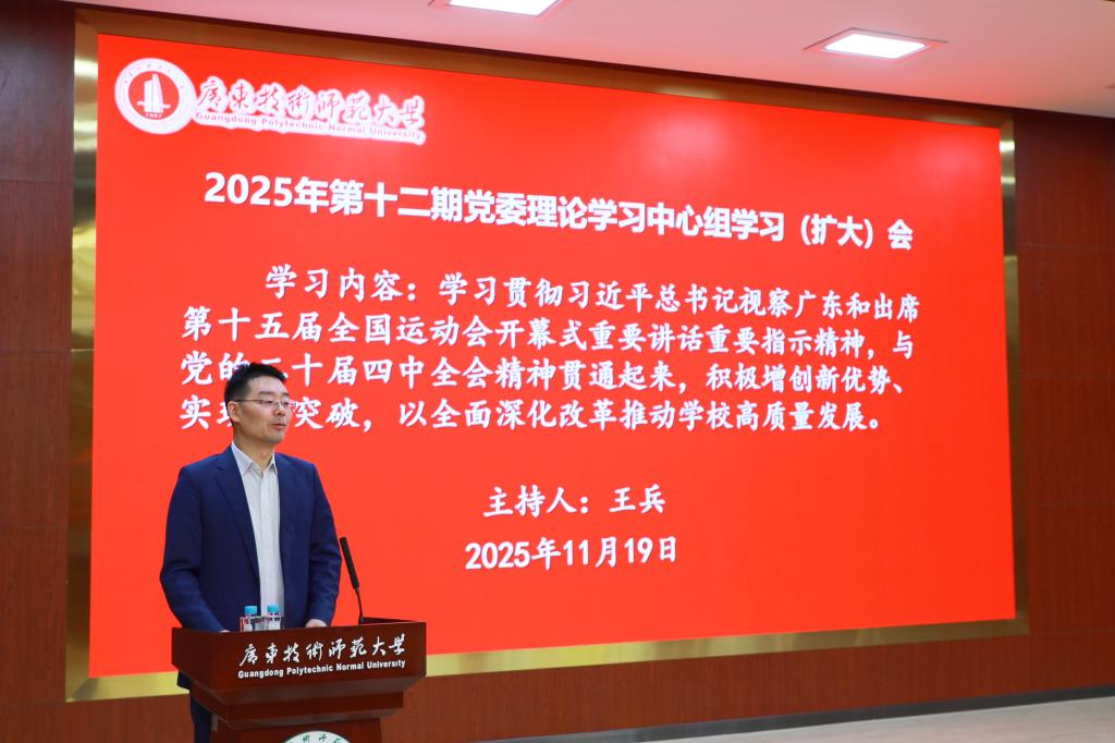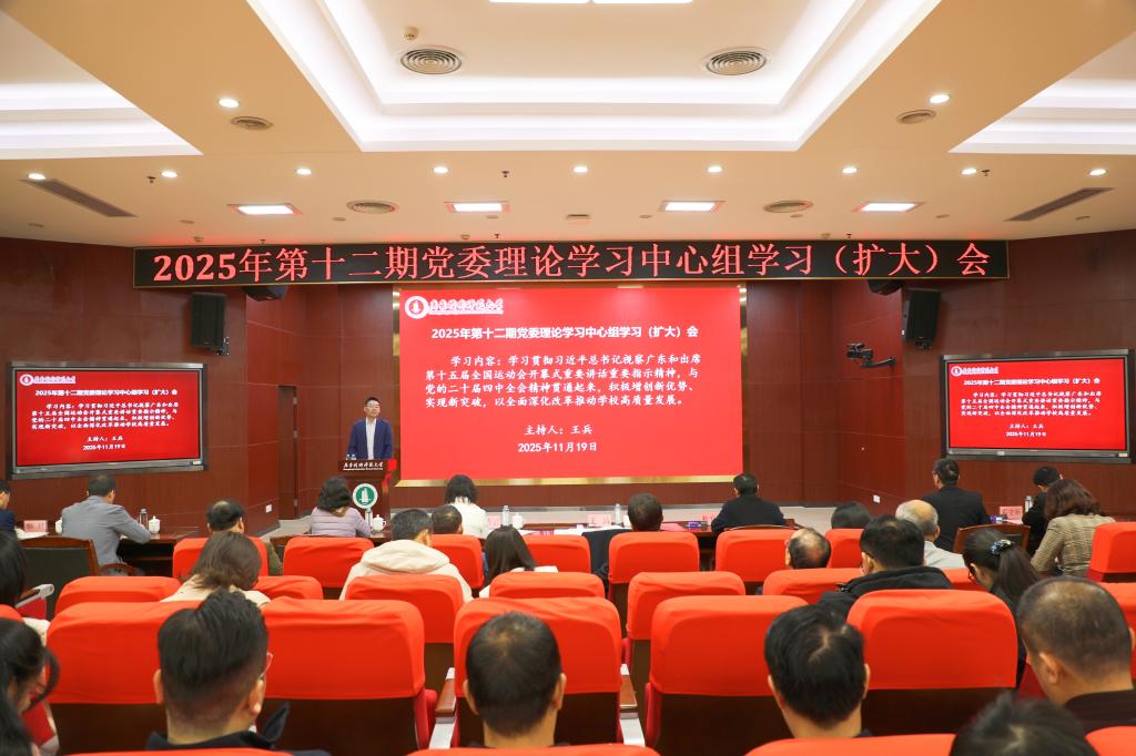 为深入学习领会习近平新时代中国特色社会主义思想的核心要义、精神实质、丰富内涵和实践要求,11月19日,学校召开2025年第十二期党委理论学习中心组学习(扩大)会,专题传达学习习近平总书记视察广东和出席第十五届全国运动会开幕式重要讲话重要指示精神,以及全省干部大会精神,研究部署学校学习宣传贯彻工作。党委书记王兵主持会议并讲话。全体校领导,党委理论学习中心组成员、全体中层干部参加学习会。