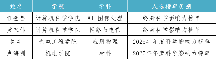 近日,斯坦福大学(Stanford University)和国际权威学术出版社爱思唯尔(Elsevier)共同发布2025年全球前2%顶尖科学家榜单(World's Top 2% Scientists),我校任金昌教授、黄永伟教授入选“终身科学影响力榜单”;吴丰副教授、卢海洲副教授入选“2025年年度科学影响力榜单”。