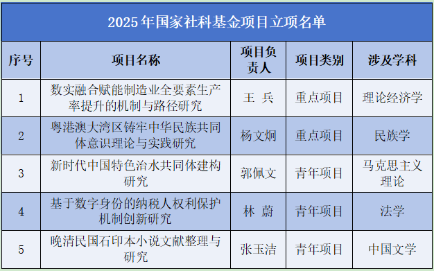 9月5日下午,全国哲学社会科学工作办公室公示了2025年国家社会科学基金年度项目立项情况,我校获批5项,其中重点项目2项,青年项目3项。2项重点项目的获批,是学校哲学社会科学研究领域的重大突破,标志着我校科研实力和学科建设水平迈向新台阶。
