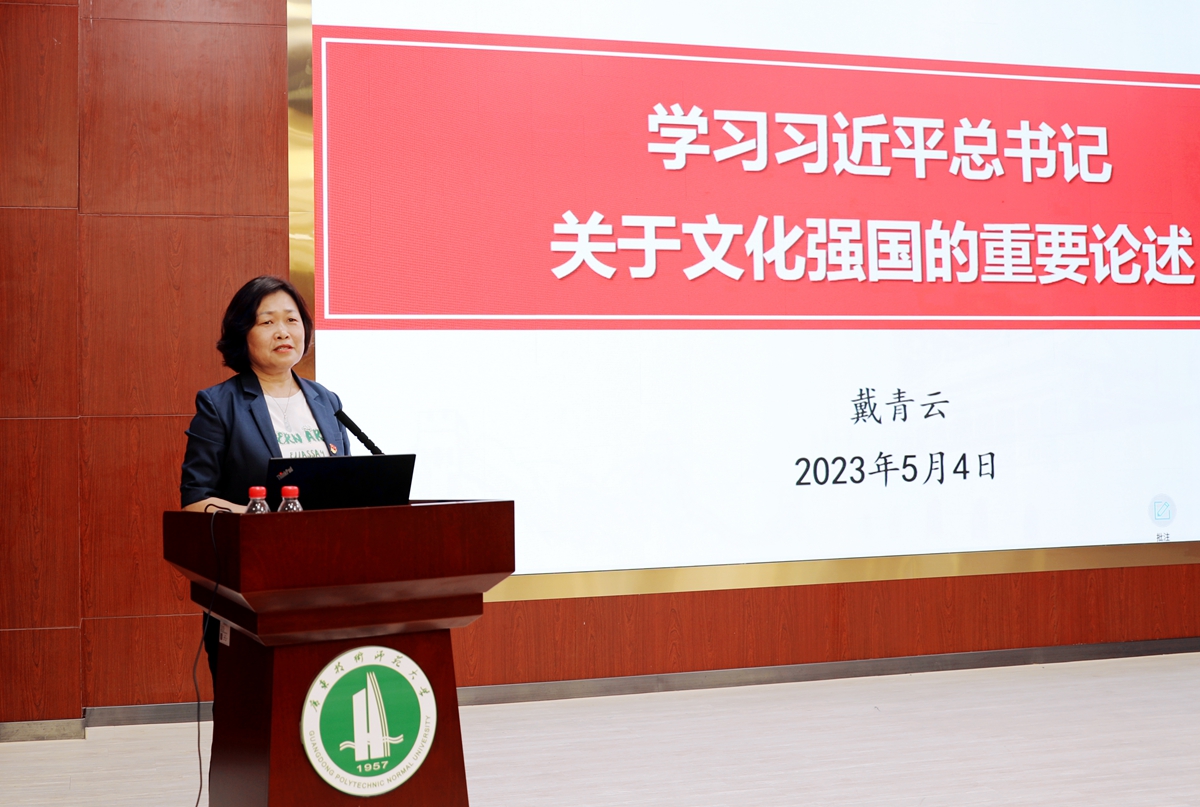 戴青云指出,大学文化建设要坚持铸魂立心、以人为本、融合发展、彰显胸怀。大学文化建设是一项战略任务,也是一个长期的系统工程。我们要坚持马克思主义在意识形态领域的指导地位,广泛弘扬社会主义核心价值观并将其融入到师生生活各个方面。她强调,变革时代的可以是技术,引领时代的永远是思想,大学文化是学校建设的灵魂和内在动因,决定着学校的发展方向和精神品格。