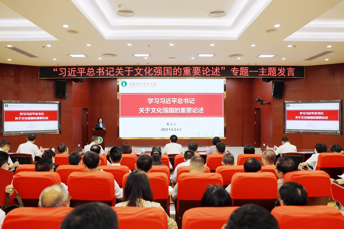 孙燕青表示,戴青云校长的报告站位高远、紧扣实际、内容丰富、深入浅出,为广大党员干部深刻理解、全面把握习近平总书记关于文化强国的重要论述提供了权威辅导,对我校锚定国家“十四五”时期文化建设的主要目标和2035年建成文化强国的远景目标,制定符合我校发展实际的路线图、时间表,提供顶层设计样本,为我们发展以师生为中心的文化,讲好广师大故事、传播好广师大声音,提供了坚实的理论基础。