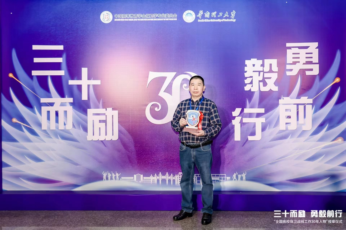 5月19日上午,“高校保卫战线工作30年人物”授章仪式在华南理工大学举行。本次活动以“三十而励 勇毅前行”为主题,旨在弘扬坚守高校保卫战线满30年人物的精神品质,号召全国高校保卫工作者进一步担当作为、守正创新、砥砺奋进,为推进国家安全体系与能力现代化贡献力量。经各省级学会、高校推荐,共有224位“高校保卫战线工作30年”人物代表。授章仪式分为初心篇、忠诚篇、服务篇、前行篇四个环节进行,回顾了高校保卫工作30年发展历程,并为50位“高校保卫战线工作30年人物”代表颁授纪念章。我校保卫干部黄文忠同志获此殊荣。