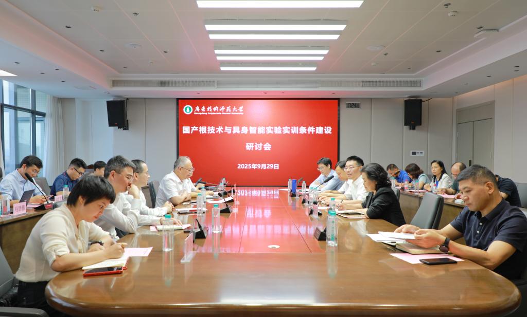 9月29日下午,我校在东校区成功召开国产根技术与具身智能实验实训条件建设研讨会。会议聚焦国产根技术与具身智能在教育实训中的深度融合,旨在推动产教深度融合及高水平实验实训平台建设,助力复合型技术人才培养。学校党委书记王兵、校长戴青云、副校长邓文新,华为技术有限公司教育医疗业务部总裁卢永平、华数机器人有限公司总经理杨海滨等企业代表,以及相关职能部门和二级学院相关负责人参会。会议由邓文新主持。