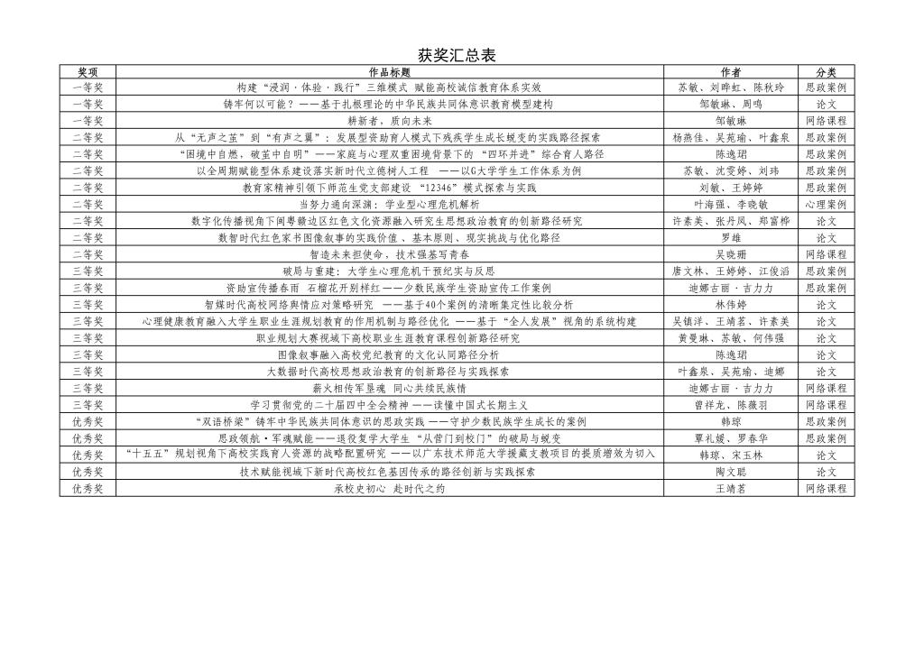本次获奖作品覆盖面广,内容涵盖党团教育、中华民族共同体意识教育、红色文化传承、心理健康教育、职业生涯规划、资助育人及学生工作体系构建等重点领域,充分展现了学工队伍的扎实理论功底和创新实践能力,也是我校将思想政治工作体系全面融入“做人好、身体好、就业好”的“三好”育人目标,推动学生工作迈向高质量发展的新契机。