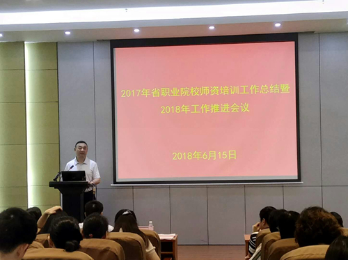 郭杰在会上致欢迎辞,对参会领导和专家的热烈欢迎,并介绍了我校概况和发展现状。项目办负责人对2017年度职业院校师资培训工作、2018年国培和省培推进落实情况进行了通报说明,并介绍了项目办下一步推进全省职业教师资培训工作的思路。