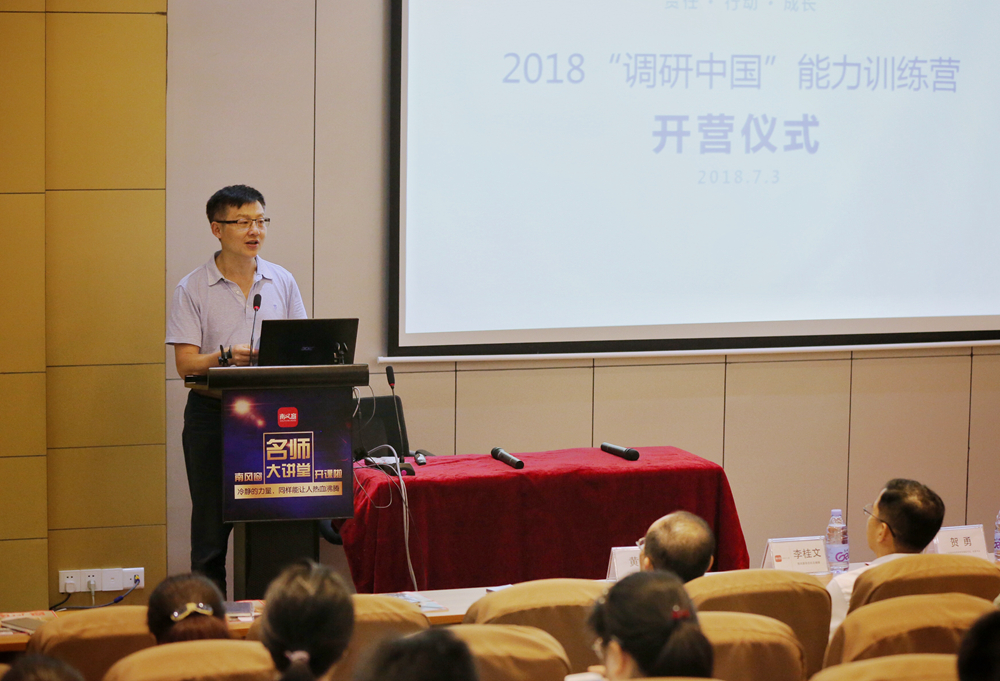 贺勇代表学院向参加这次训练营活动的老师和学员表示热烈欢迎,并对2018“调研中国”项目评选出来的30支精英团队表示祝贺。贺勇指出,当代大学生要实现自己的社会价值,就需要关心社会问题,并通过社会调查和社会实践来开阔视野、增长才干,鼓励大学生走出校园,走向社会,发现问题,并运用自己的所学寻找有效的解决方法。