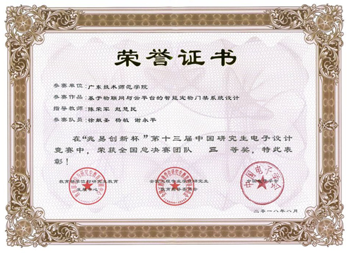 8月21日, “兆易创新杯”第十三届中国研究生电子设计竞赛总决赛结果公布。我院学生徐献胜、杨敏、谢永平组成的团队(指导老师陈荣军、赵慧民)荣获全国总结赛团队三等奖。