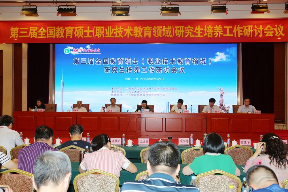 9月27日—28日,由全国教育专业学位研究生教育指导委员会主办、广东技术师范学院承办、广东恒电信息科技股份有限公司协办的全国教育硕士(职业技术教育领域)研究生(以下简称“职教专硕”)培养工作研讨会议在广州召开。来自全国48所高校的近240名代表参加了会议。学院院长骆少明、教育部教师司正处级调研员李桂兰、广东省学位办主任欧阳谦、全国教育专业学位研究生教育指导委员会专家组委员汤生玲分别致辞。学院副院长戴青云主持开幕式。