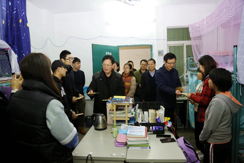 12月11日,校党委书记凌靖波,党委副书记、纪委书记贺勇带领学生处、有关二级学院等单位负责人深入学生宿舍,看望学生,为家庭经济困难学生送温暖。