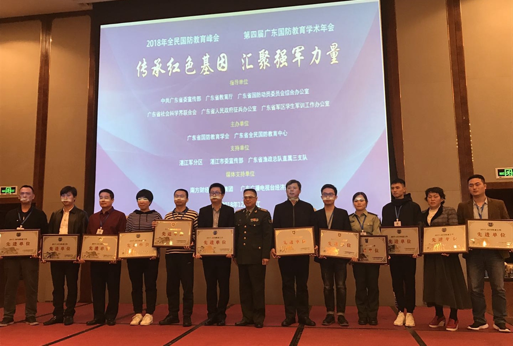2018年12月27日—29日,广东省国防教育学会主办的2018年广东国防教育峰会暨第四届广东国防教育学术年会在湛江召开。会议对2018年度广东省国防教育工作中的先进单位和个人进行表彰。我校被授予“广东省国防教育工作先进单位”,沈雯婷老师获“广东省国防教育工作先进个人”。