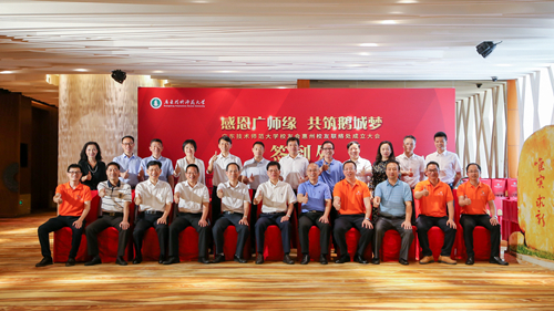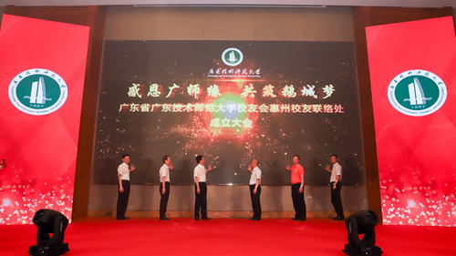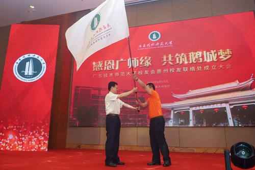 在热烈掌声中,凌靖波、潘自勉与惠州校友代表共同为惠州校友联络处揭幕、并向联络处负责人颁发聘书和授旗。
