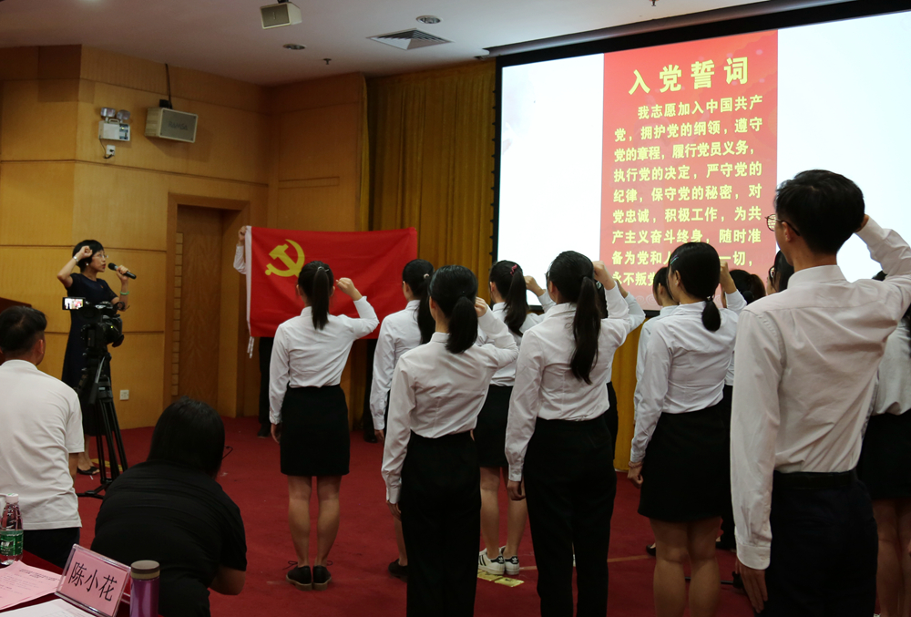大会的第二个环节是举行新党员代表入党宣誓仪式。党的十九大代表陈小花老师带领新党员代表宣读入党誓词,全场党员师生重温入党誓词。