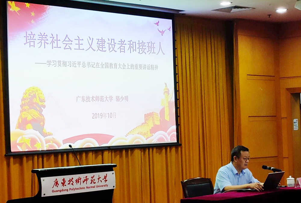 骆少明表示,要深入学习习近平总书记关于教育的重要论述,坚持认真对标定位,全力以赴书写好新时代学校改革攻坚的“奋进之笔”,奋力推进将我校做大做强的发展战略,努力实现培养好全国一流的职教师资的人才输出。骆少明强调,2019年是广东技术师范大学元年,学校要下大力气打一场综合改革攻坚战。改革是学校教育发展的驱动力,也是广师大人追求高质量发展的最佳机遇,要抓住机遇,实施内涵发展,深化综合改革,深入学习贯彻习近平新时代中国特色社会主义思想,做新时代的建设者。