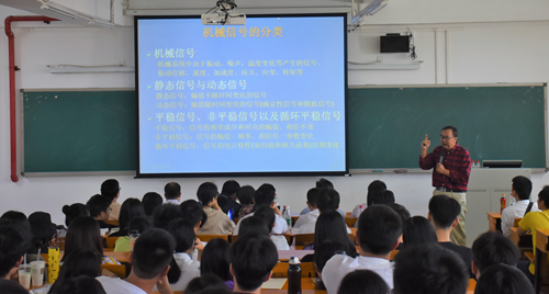 丁康教授以“动态信号分析”在汽车工业中的广泛应用为切入点,对机械信号的分类和现代分析处理方法的发展、原理、特点及局限性作了详细分析,特别是在介绍他的高规格学术成果“离散频谱校正方法”及其在工程中的广泛应用时,引用了大量的工程实例,把深奥理论讲述得深入浅出、通俗易懂,赢得现场师生阵阵热烈掌声,充分彰显了大师级专家严谨的学术态度、活跃的创新思维和深厚的学术造诣。