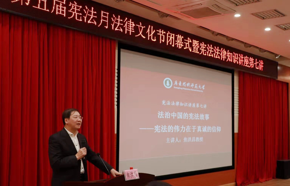 12月9日,我校第五届宪法月法律文化节闭幕式暨宪法法律知识讲座第七讲在白云校区三教104报告厅举办。中国宪法学研究会副会长、中国政法大学法学院焦洪昌教授,中国宪法学研究会副会长、华南理工大学法学院(知识产权学院)吴家清教授,我校法学与知识产权学院党政领导班子、全体教职工,我校依法治校办专职工作人员,广东财经大学部分教师及我校300余名学生出席了活动。讲座由法学与知识产权学院院长黄俊辉主持。