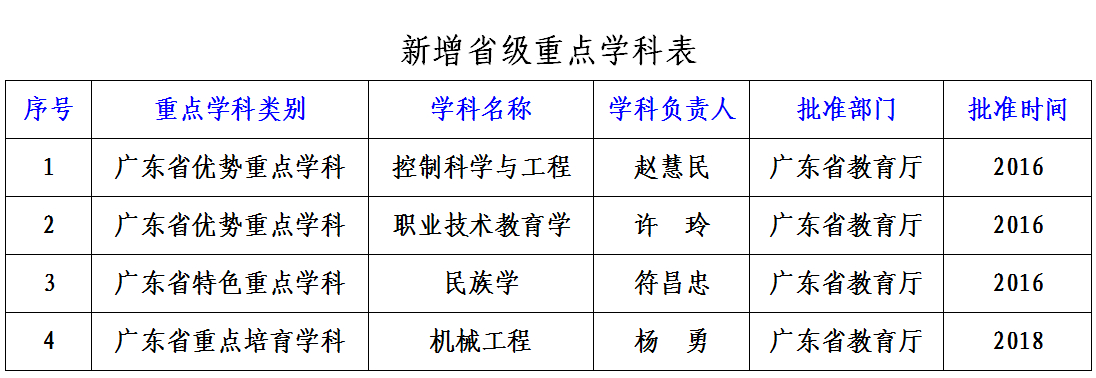 我校主动对接国家和广东经济社会发展需求,调整学科专业,打造重点学科和特色学科。新增设立3个理工类二级学院、调整设立5个二级学院、合并设立6个二级学院、更名设立1个二级学院。学校新增控制科学与工程、职业技术教育学2个省级优势重点学科,新增民族学1个省级特色重点学科,新增机械工程1个省级重点培育学科,新增通信与信息系统、中国现当代文学、控制科学与工程等3个珠江学者设岗学科。新增一级学科硕士点3个,涵盖10个二级学科方向;新增专业硕士学位授权点3个,涉及专业领域(方向)17个,学校成为“职业学校教师在职攻读硕士专业学位”“少数民族高层次骨干人才计划”和“退役大学生士兵计划”研究生招生培养单位。目前有本科专业67个,其中理工类专业34个,占比51%;师范类专业30个,占比45%,构建了高素质职教师资与应用型人才的学科专业培养体系。