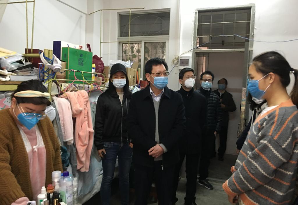 凌靖波随后率队走访了财务处,了解开学初财务资金保障运行情况。在学生处,凌靖波认真听取了学生处副处长全翠珍关于学生防疫工作情况的汇报,并走访学生宿舍,看望和慰问留校本科生和研究生,亲切询问学生们学习和生活状态,及时回应了他们的关切,对他们在防疫期间的表现给予充分肯定,提出了有关防疫要求。凌靖波指出,当前特殊时期最重要的任务是做好学生的自我防护工作,确保学生生命安全和身体健康是学校压倒一切的工作,要认真细致做好学生的心理工作,要求学生按照《广东技术师范大学防控新型冠状病毒感染的肺炎疫情时期学生行为规范》来严格要求自己,强化主人翁意识,主动调整心态,积极配合学校防控工作,相关部门和单位还要密切关注留校少数民族学生的情况,做好各项防疫工作,切实维护学生生命安全和身体健康。