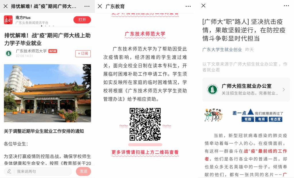 南方+、广东教育、广东大学生就业创业公众号报道学校线上就业、资助等工作
