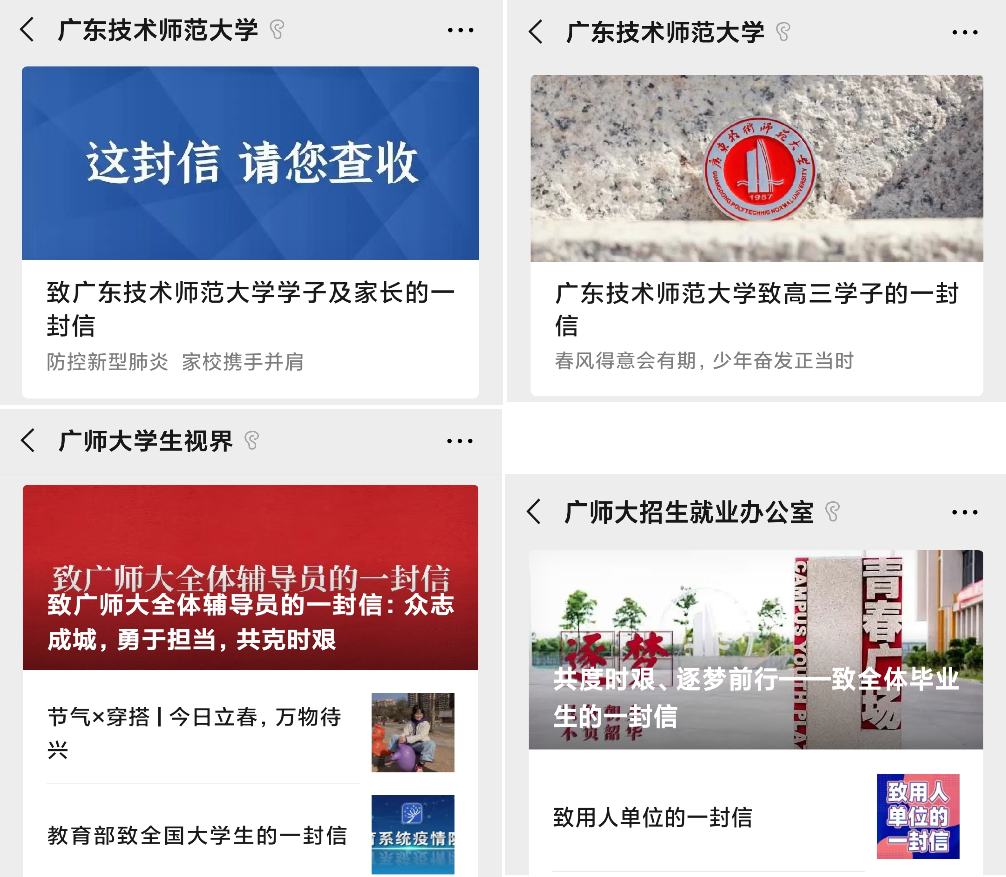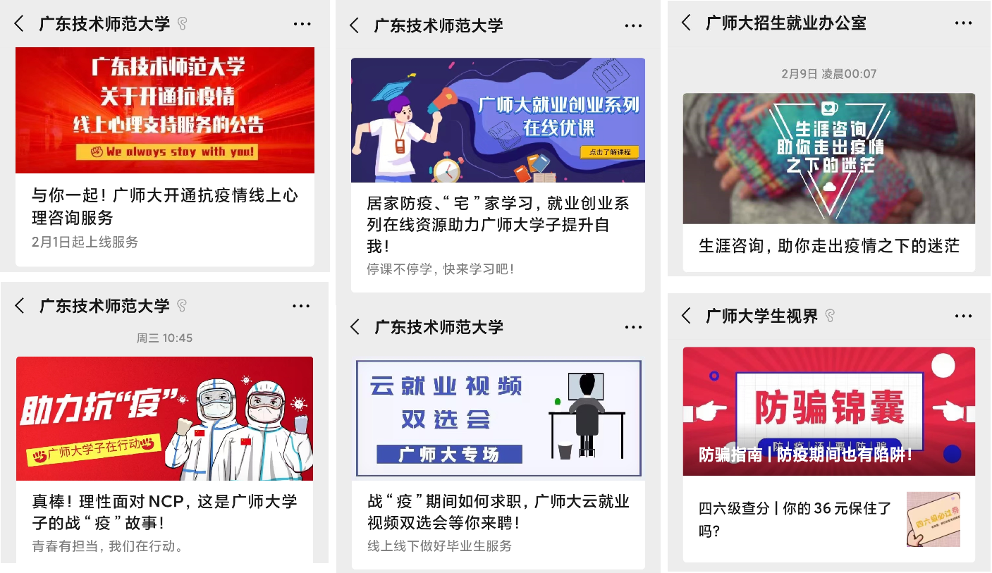 加强思想引领,实现防控全覆盖。及时发布《广东技术师范大学防控新型冠状病毒肺炎疫情时期学生行为规范》,深入挖掘和宣传抗疫榜样和典型事迹,推送《直面NCP | 广师大学子的抗“疫”故事》,通过“广师大学生视界”、“广师大招生就业办公室”微信公众号等,强化正面引导、壮大主流舆论、稳定学生思想。积极引导毕业生到西部去、到基层去、到部队去建功立业。利用新媒体平台发布《致广东技术师范大学学子及家长的一封信》《致广师大全体辅导员的一封信》《致用人单位的一封信》《致全体毕业生的一封信》等宣传文章11篇;选推《携科战疫科学防护》等易班优课课程36门,防诈骗《战“疫”面前,拒绝谎言》等科普内容13篇;发布相关通知8篇。以上防疫推文在学生朋友圈广泛宣传,目前阅读量近74257余人次。