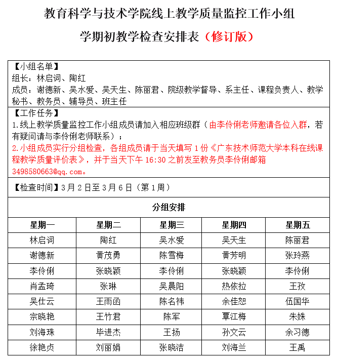 三是制定实施细则,确保质量监控制度化、规范化、标准化。在现有线上教学质量保障体系的基础上,学院制定了本科线上教学质量监控实施细则,成立了林启词书记和陶红院长任组长,副书记、副院长、系主任、教学督导、课程负责人、班主任、教务员、辅导员等37人的质量监控小组。其中,线上教学质量监控小组成员分为5个小组,加入相应的上课班级教学群,每日参与听课观课,检查线上教学准备情况和线上教学运行与组织情况。同时,为了更好地开展教学督导工作,学院党政联席会议迅速任命新的教学督导成员,按学校要求开展督导工作。