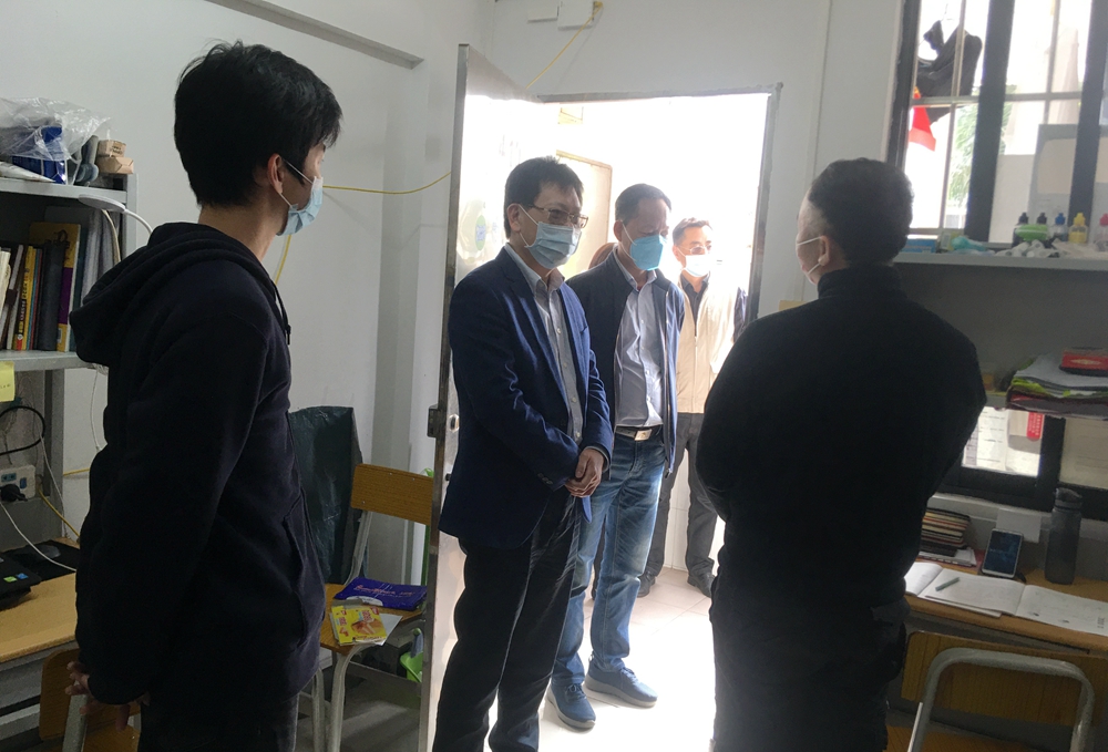 3月10日上午,学校党委书记凌靖波,副校长许玲、黄秋文,率党办、后勤服务管理处、保卫处、学生处等部门负责同志,到各校区检查疫情防控、错峰上班、线上教学等工作情况。