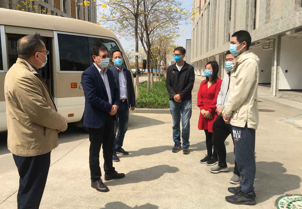 最后,凌靖波率队到白云校区检查疫情防控工作、线上教学和校园管理等情况,深入防控一线慰问了保卫处、后勤服务管理处同志及辅导员,向保卫处同志发放防控物资,到白云校区工地和饭堂分别检查实训楼建设和食品安全情况,并走访了汽车与交通工程学院、法学与知识产权学院,详细了解了线上教学、学科建设、实验室建设、值班值守等工作情况。