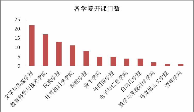 本周完成开课的93门次课程中,文学与传媒学院开设的课程最多,达22门,其次为教育科学与技术学院和民族学院,分别为17门、13门。各学院开课详细情况如图所示。