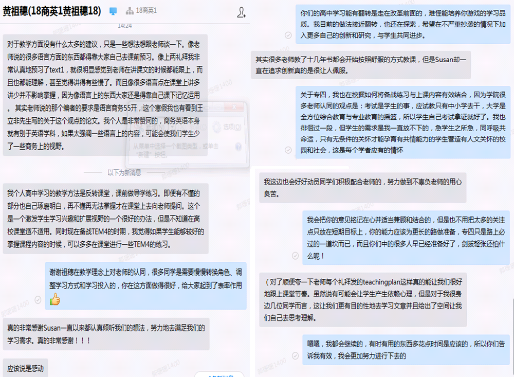 真正优秀的课堂不仅要讲究理论的架构、课堂的设计、恰当的教学技术和手段的使用、有效的课堂活动的开展,更重要的是要从学生中来到学生中去,从学生们的反馈中不断改进老师们的教学,实现真正意义上的教学相长。在《综合商务英语》课程线上教学改革的这三周来,课程的开展得到许多学生的学习资源的开发、积极又具有建设性反馈的分享,这些都无疑给课程后期的发展提供了物质保障和智力支持。网络时代的原住民给课程建设提供了不可或缺的生命力。