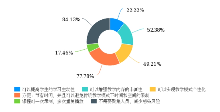 调查显示,教师们认为线上教学的优点主要为:不需要聚集人员,减少感染风险;方便、节约时间,可以避免传统教学模式下时间和空间的限制;可以增强教学内容的丰富性;实现教学模式的个性化。
