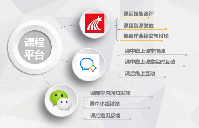 从教学目标出发,经过详细研判选定教学平台。本课程对学生参与度要求较高,同时也需要学生在课前及课后的自主学习及互动,因此对课程平台的选择,应当能够涵盖课前、课中、课后三个阶段的不同需要。超星学习通平台作为一直以来专注教学的专业平台,对平台栏目的设计较通用社交平台更能满足专业教学的需求,但同时也存在大量学生涌入平台同时学习时,平台操作稳定性不够的问题。而一些通用的社交平台,如微信、企业微信、腾讯QQ等,在实时通讯的方面则做得更好,平台更为稳定,抗冲击力也更强,更能面对大流量学生同时上课的问题。综合以上考量,我们设定以超星学习通为课前及课后阶段主体平台,企业微信、微信为课中主体平台相结合的方式展开在线教学方案设计。