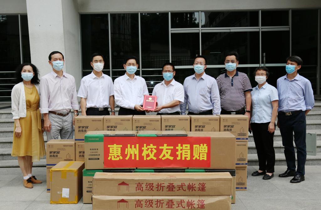 惠州校友向母校捐赠热成像体温检测系统1套、手持红外额温枪30支、一次性医用口罩10000个、消毒液120瓶(2公斤/瓶)(价值约6.8万元)。其中10000个医用口罩,由1991届校友、惠州市汇流实业有限公司董事长钟冠斌捐赠。所赠物资由惠州校友联络处主任、2004届校友、深圳市航盛电子股份有限公司工程中心总监林振国,副主任、1991届校友、美格玩具(惠州)有限公司总经理杨兵,以及1990届校友、中国工商银行惠州分行副行长杨建荣,1991届校友、中国建设银行惠州分行江北支行副行长陈瑞英一行送抵学校。