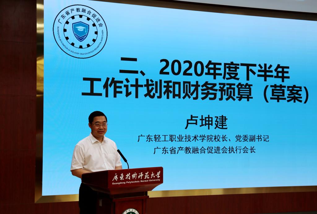 广东轻工职业技术学院校长、党委副书记卢坤建代表促进会执行会长单位,提请理事会审议2020年度下半年促进会工作计划和财务预算草案。卢坤建说,促进会的工作即将全面启动,从聚焦推动我省产教融合全面发展,加强理论和业务学习,健全完善促进会组织架构和加强自身建设等4个方向,初步计划16项具体工作,工作计划和预算草案在吸收各理事单位的意见和建议后进一步完善和细化,促进会在运行中将不断加强机构、人员、资金和活动管理。