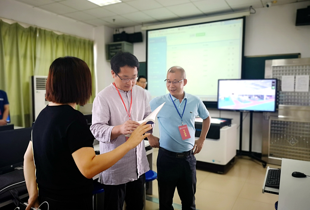 图为认证专家组成员刘细丰副教授走访会计与财务综合实验室,了解实验平台的实训软件及相对应的课程,并与财经学院相关负责人进行深入交流
