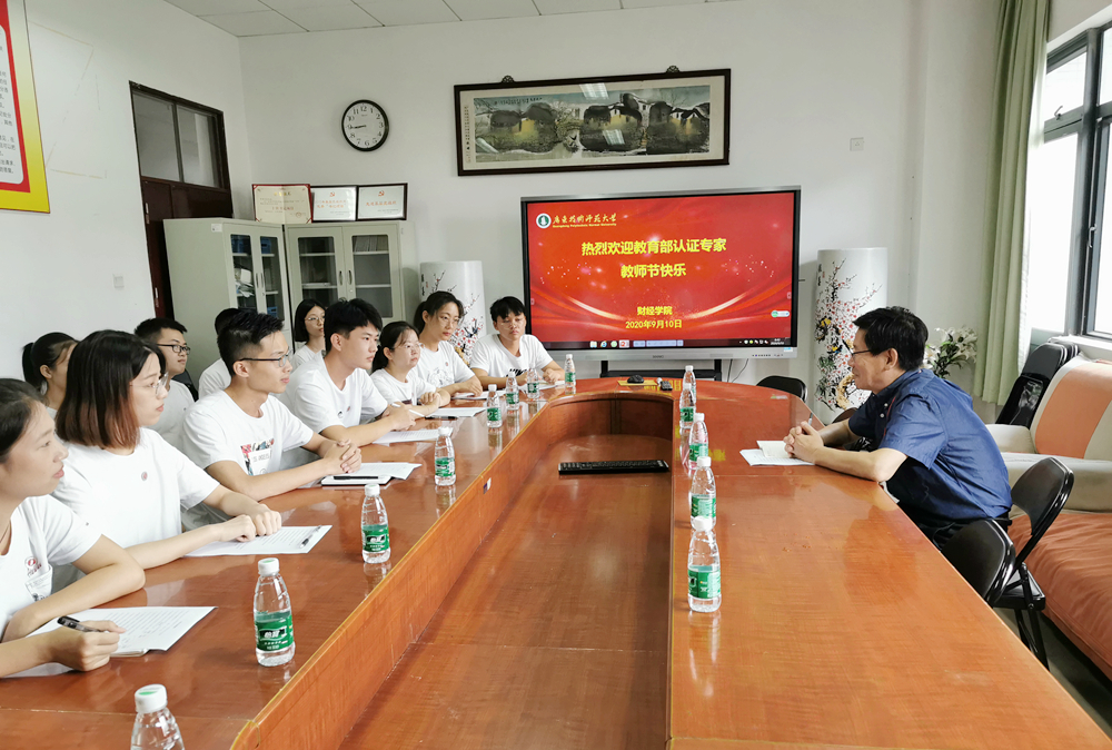 图为认证专家组成员曹晔教授与财务会计教育专业学生座谈,学生们分别对师范生的“一践行三学会”、专业课程学习、师德的理解、教育类课程设置等进行讨论