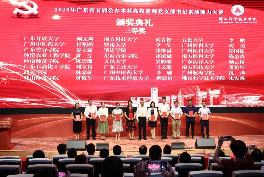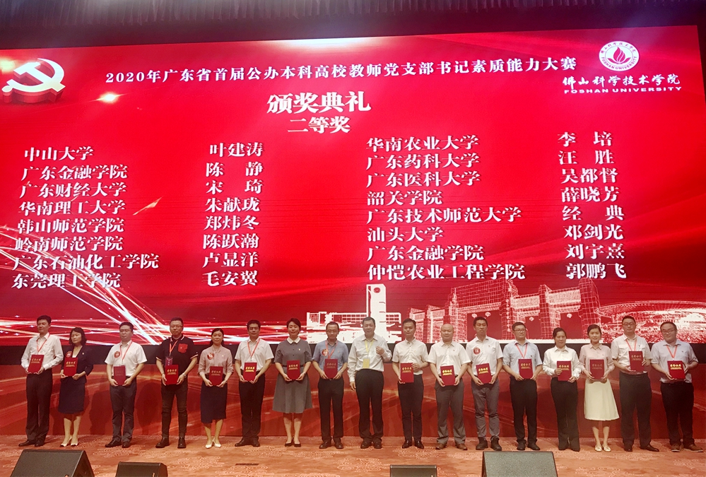 为贯彻落实新时代党的建设总要求,落实全面从严治党要求、加强高校基层党组织建设,选树培育一批优秀教师党支部书记,9月26日,由中共广东省委教育工委主办、省高校党建研究会本科分会承办的2020年广东省首届公办本科高校教师党支部书记素质能力大赛决赛第二阶段现场赛在佛山科学技术学院举行。全省39所公办本科高校共78名“双带头人”教师党支部书记参加了比赛,我校民族学院教工党支部书记经典老师和法学与知识产权学院法学科研团队教工党支部书记柳建启老师分获二、三等奖。
