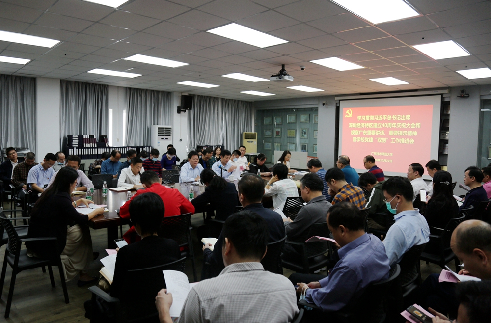 为学习贯彻习近平总书记出席深圳经济特区建立40周年庆祝大会和视察广东重要讲话、重要指示精神,总结学校《全面加强基层党组织建设三年行动计划(2018-2020年)》实施情况和“全省党建工作示范高校”第一年建设情况,推动学校基层党组织建设全面进步、全面过硬,10月30日,学校在东校区福慧美术楼1002室召开学习贯彻习近平总书记出席深圳经济特区建立40周年庆祝大会和视察广东重要讲话、重要指示精神暨学校党建“双创”工作推进会。学校党委书记凌靖波,党委副书记、纪委书记、监察专员贺勇出席会议,党委部门负责人、二级党组织书记、机关党委各党支部书记共50余人参加了会议。会议由贺勇主持。
