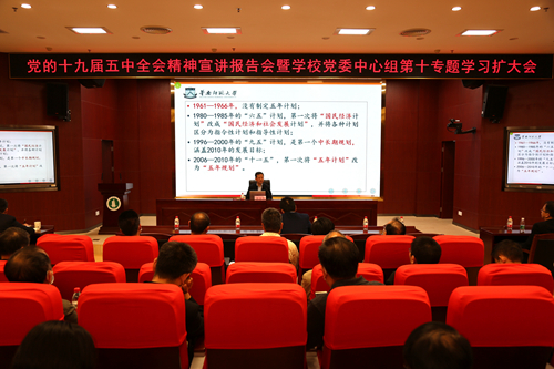 12月1日, 党的十九届五中全会宣讲报告会暨学校党委中心组第十专题学习扩大会在东校区一教208举行,邀请省委宣讲团成员、华南师范大学马克思主义学院院长陈金龙教授作宣讲报告。学校党委书记凌靖波主持会议,党委中心组全体成员、中层干部、师生代表近200人参会。