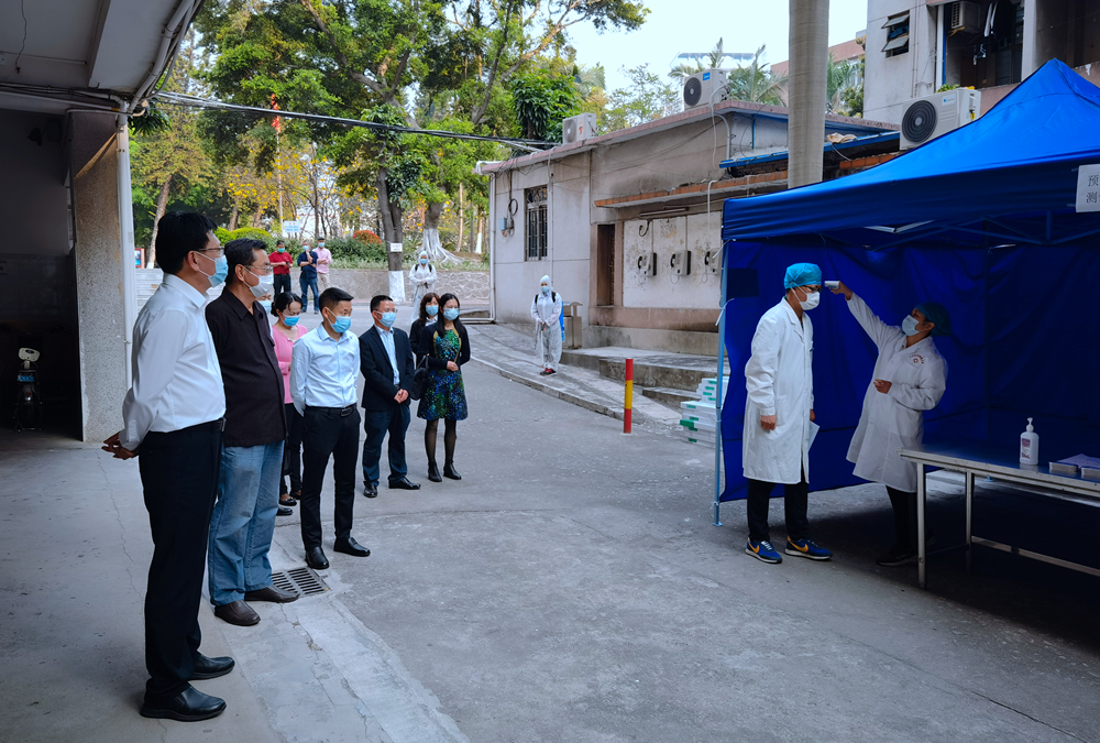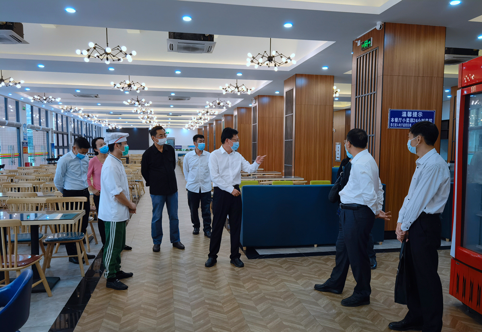 学校党委书记凌靖波观摩了东校区的演练,根据疫情防控重点区域和关键部位情况,重点检查了校门口和校医室对疫情防控常态化管理及应急处置能力、防疫物资储备情况等;走访了学校饭堂,了解饭堂员工健康状况和食品卫生安全情况。