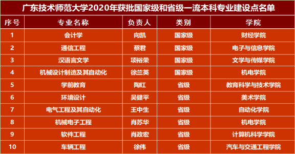 近日,教育部发布了《关于公布2020年度国家级和省级一流本科专业建设点名单的通知》(教高厅函〔2021〕7号),我校共10个专业成功入选。其中,会计学、通信工程、汉语言文学、机械设计制造及其自动化等4个专业入选国家级一流本科专业建设点,学前教育等6个专业入选省级一流本科专业建设点。
