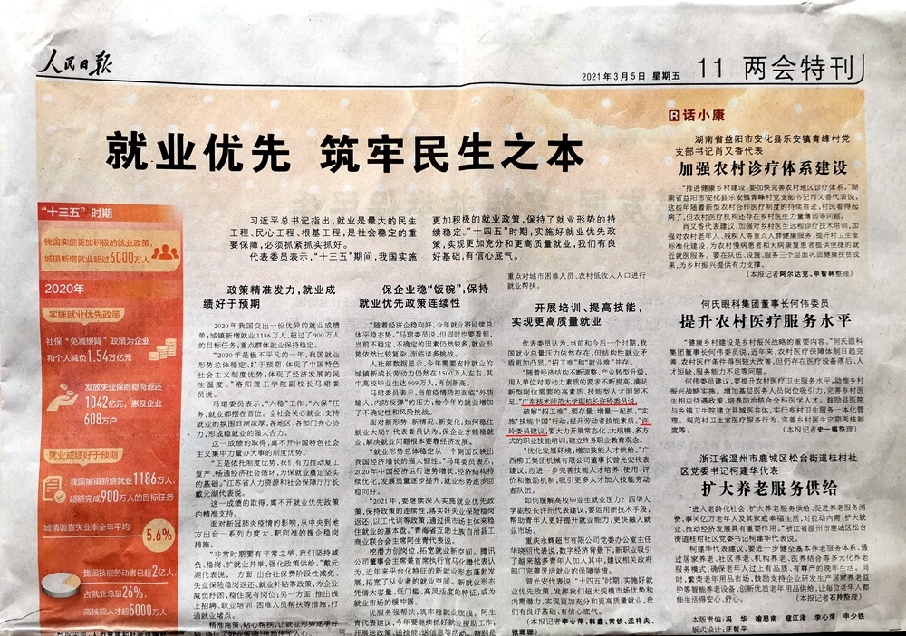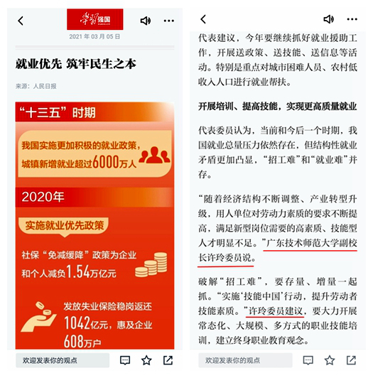 《人民日报》3月5日第11版报道全国政协委员、民建广东省委会副主委、我校副校长许玲参加全国两会献言献策情况。“学习强国”学习平台全国总台、人民网等也纷纷刊发报道。现官网予以全文转载,供师生们学习。