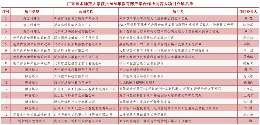 日前,教育部高等教育司发布《关于公布2020年产学合作协同育人项目立项名单的通知》(教高司函〔2021〕3号),我校17个项目获批立项,立项项目涉及“新工科建设”等5个项目类别,立项数量居省内同类院校前列。截至目前,我校共获批教育部产学合作协同育人项目143项。