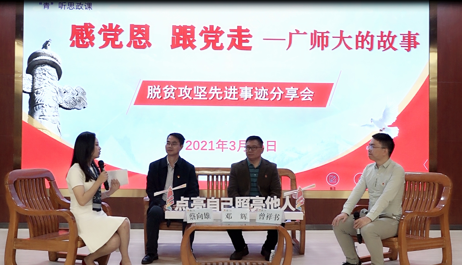 3月26日下午,“感党恩•跟党走——广师大的故事”脱贫攻坚先进事迹分享会暨2021年“青马工程”学生骨干思想引领学习会在东校区第一教学楼208举行,校团委全体干部、各学院团委书记、校级“青马工程”学员、学生干部代表等共200余人参会。