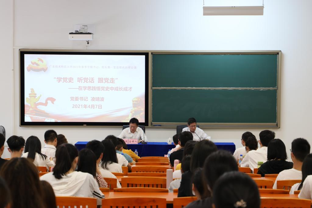 根据学校党委开展党史学习教育工作安排,4月7日下午,学校党委书记凌靖波在唯实楼101课室为师生宣讲党史。学校副校长苏晖、党委办公室、党委宣传部、河源校区管委会主要负责同志、各辅导员以及各学院学生代表等一同聆听授课,本次课程由副校长苏晖主持。