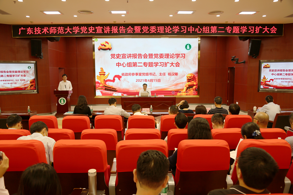 4月15日,学校在东校区一教208讲学厅举行党史宣讲报告会暨党委理论学习中心组第二专题学习扩大会,邀请广东省人民政府参事室(文史研究馆)党组书记、主任(馆长)、党史学习教育省委宣讲团成员杨汉卿作党史宣讲报告。党委理论学习中心组全体成员、中层干部、学生党员代表近200人参加了报告会。会议由学校党委书记凌靖波主持。