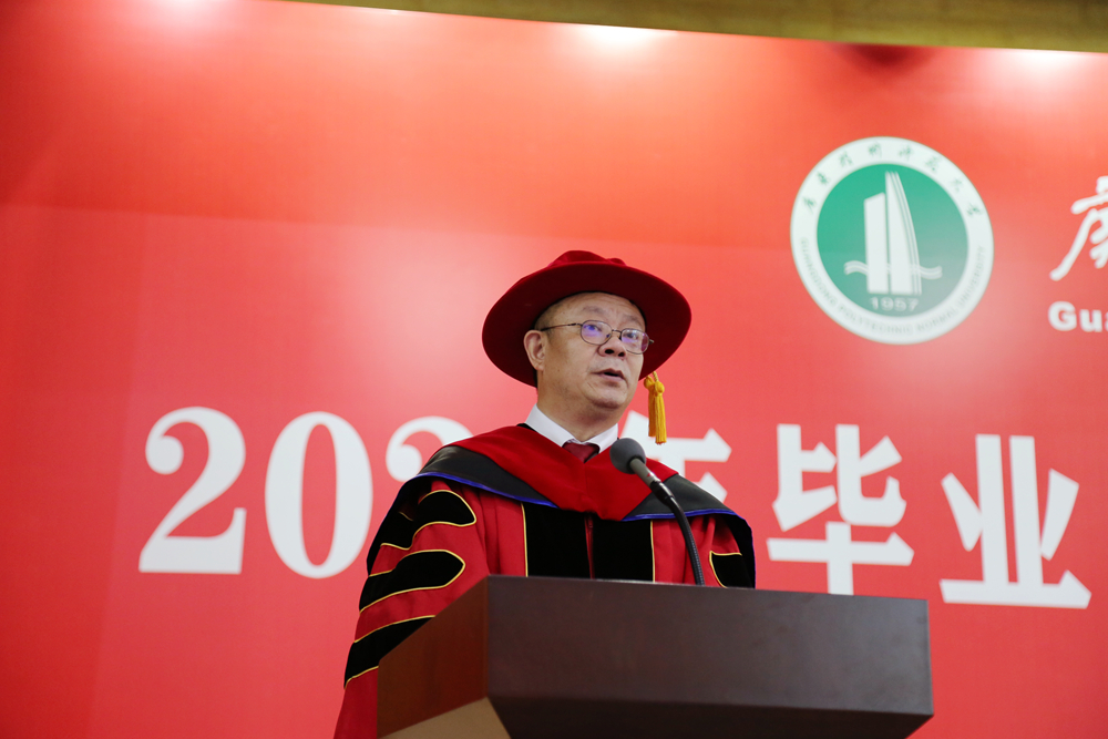 骆少明指出,毕业同学就读期间,在追梦路上满怀热忱、心系家国,勇担时代使命,报名基层就业项目人数占比为历年最高,同学们在春生夏长中深耕学业,时光年轮中镌刻青春,考研报名和考取率节节攀升,同时激发创新力量、永葆进取精神,在“挑战杯”“互联网+”等各级各类学科专业竞赛中屡创佳绩,为学校争得了荣光,为全体毕业生感到由衷骄傲,要为他们的成长与进步点赞。回顾学校2018年成功更名大学,2020年河源校区正式启用,今年又被列为博士学位授权建设单位的骄人成绩,骆少明感谢同学们对学校的信任、支持,感谢同学们为学校发展作出的努力与贡献。