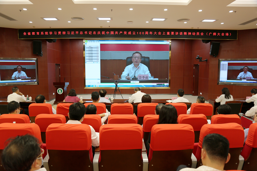 又讯:7月4日下午,根据省委教育工委的工作部署,全体校领导、中层正职负责人在东校区第一教学楼208讲学厅(广师大会场)以视频会议形式,参加了全省教育系统学习贯彻习近平总书记在庆祝中国共产党成立100周年大会上重要讲话精神动员会。
