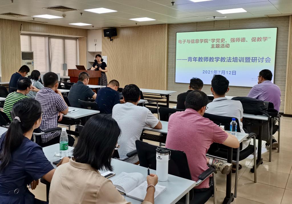 7月12日上午,电子与信息学院在东校区工业中心801举行“学党史、强师德、促教学”主题活动——青年教师教学教法培训暨研讨会,学校副校长许玲出席会议并作题为《高校教学改革与发展趋势》的讲座,电子与信息学院领导班子成员和全体青年教师参加。